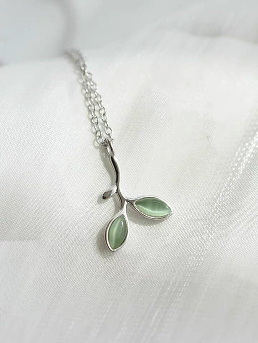 S925 실버 올리브 가지 모조 고양이 눈 그린 스톤 목걸이 ~16-17인치