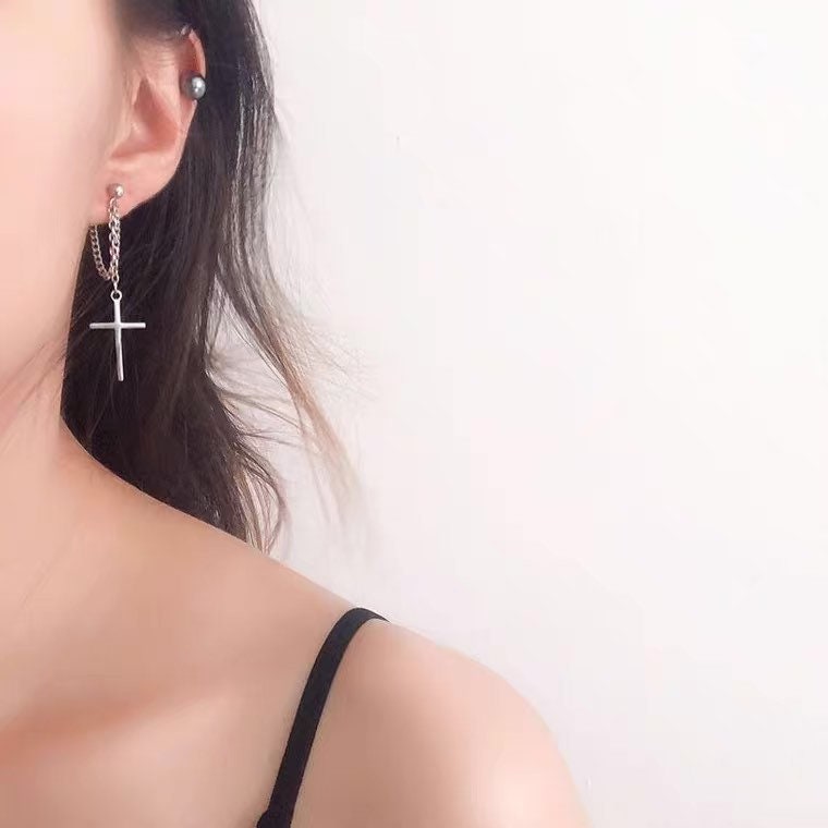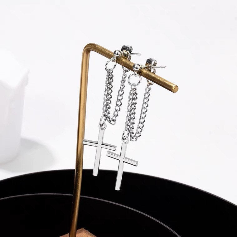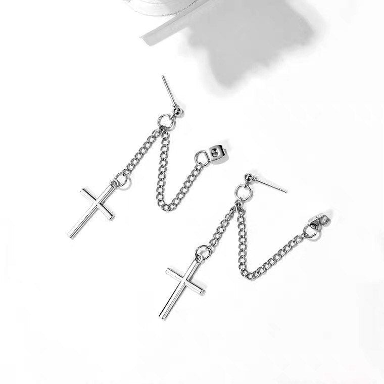 한국 패션 Kpop 스틸 크로스 체인 스터드 귀걸이 6.5cm