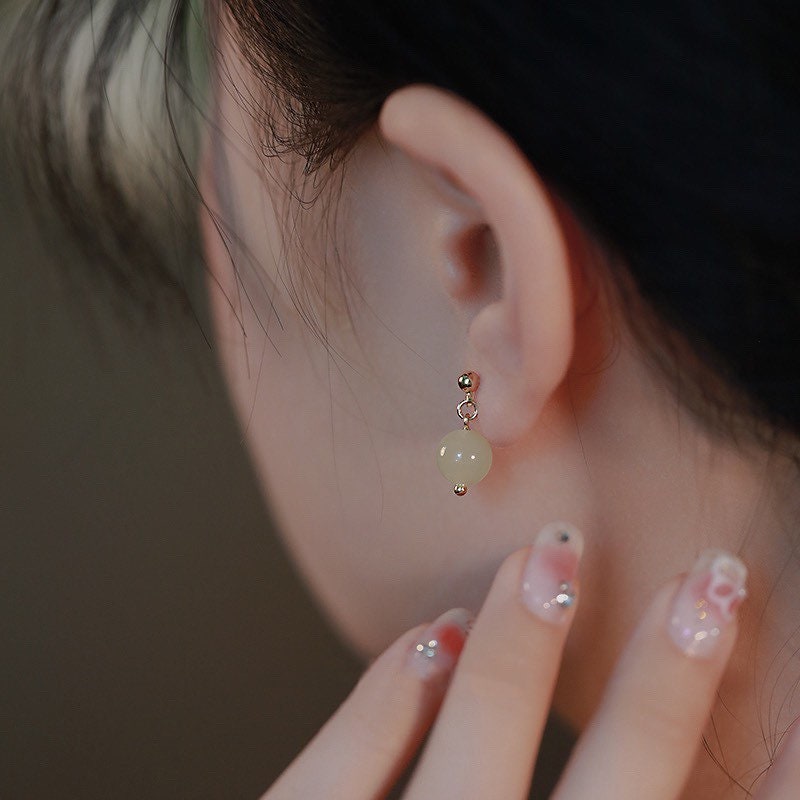 미니멀리스트 18K 골드 도금 8mm A등급 천연 보석 라이트 그린 제이드 귀걸이 스터드