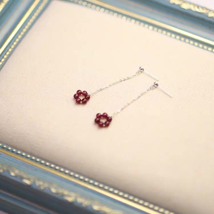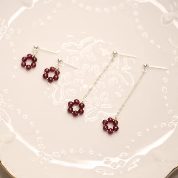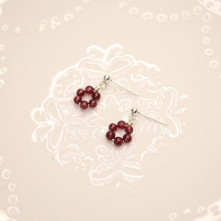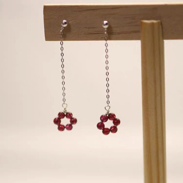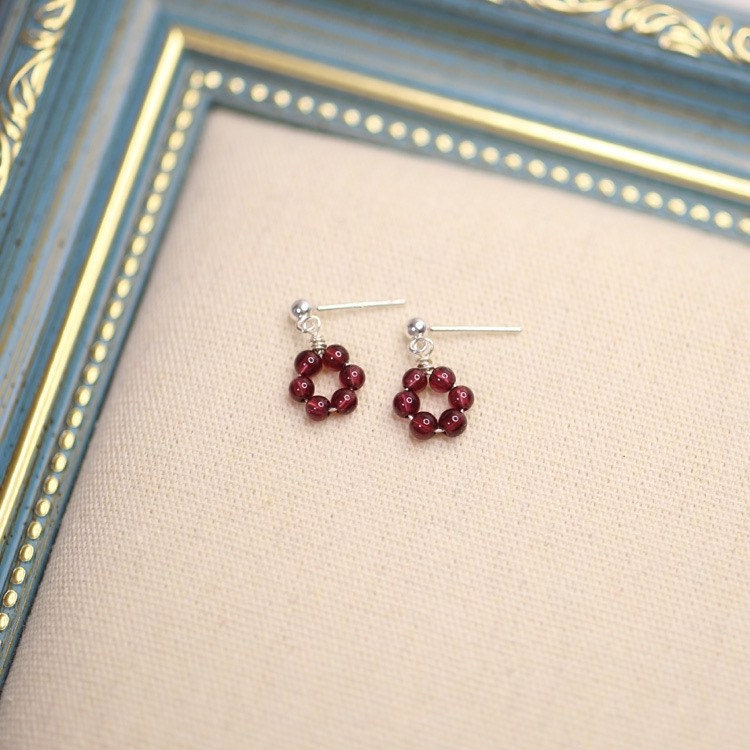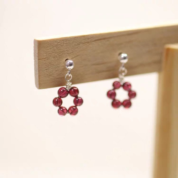 강철 꽃 와이어 포장 3mm 작은 가넷 천연 보석 귀걸이