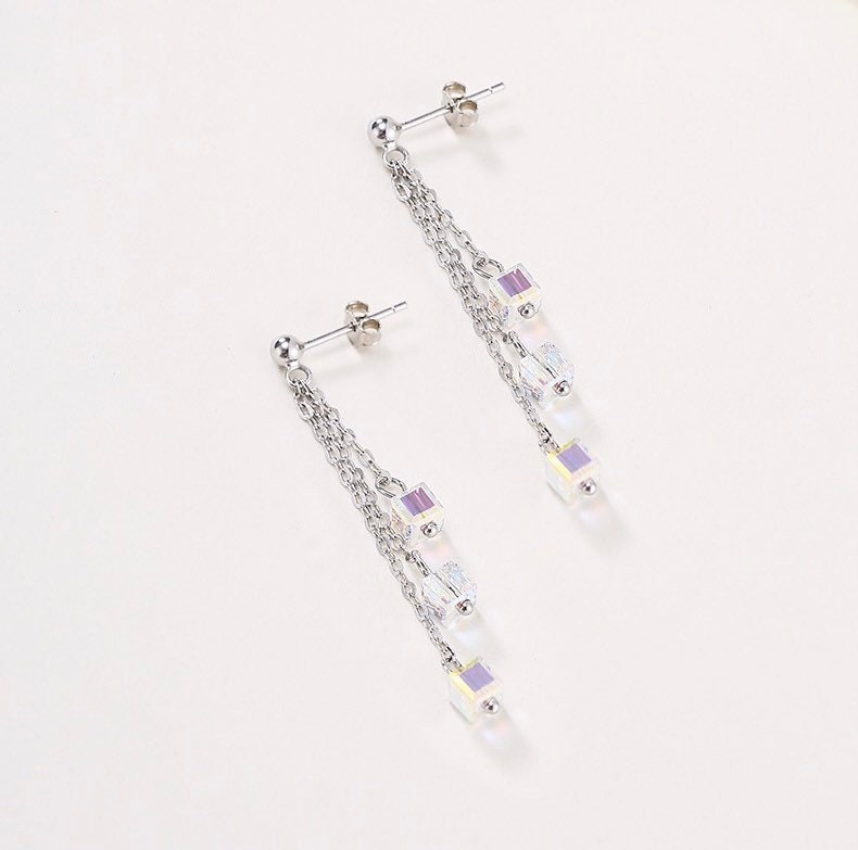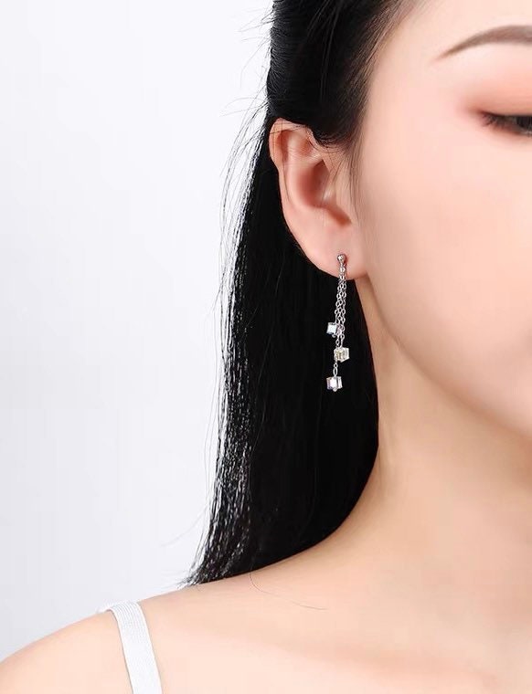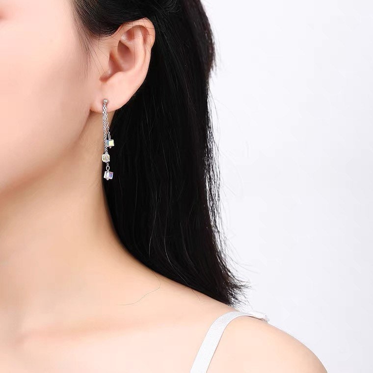 스테인레스 스틸 6mm 오스트리아 크리스탈 클리어 Ab 레인보우 슈가 큐브 3 레이어 귀걸이 5cm